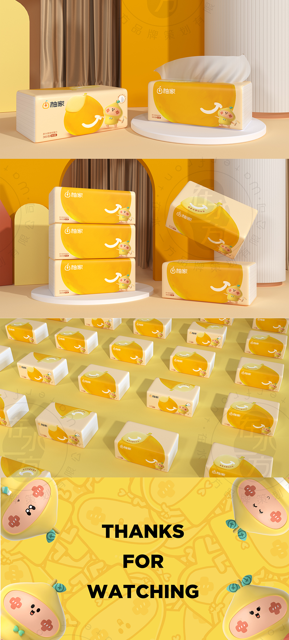 服務(wù)方案:進(jìn)入2.0時(shí)代的柚家,擁有更為明確的品牌定位路線,以迎合精致家居消費(fèi)為導(dǎo)向,全力推出一系列符合新消費(fèi)市場的優(yōu)質(zhì)紙品。放大“家”的概念,引進(jìn)柚子家族IP形象詮釋品牌對潔居生活的理解,用更為時(shí)尚有趣的方式展現(xiàn)健康品質(zhì),有助于品牌順利出圈。