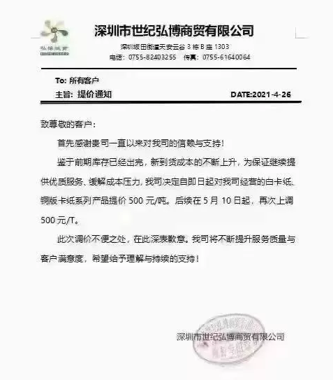 世紀(jì)弘博:即日起對我司經(jīng)營的白卡紙、銅版卡紙系列產(chǎn)品提價(jià)500元/噸。后續(xù)在5月10日起,再次上調(diào)500元/噸。