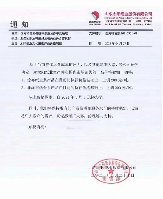 APP文化用紙:5月1日起,針對金東、金海所生產(chǎn)的各系各紙種、克重紙品價(jià)格在2021年4月基礎(chǔ)上調(diào)漲200元/噸(含稅)。