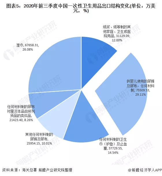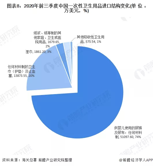 由于一次性衛(wèi)生用品種類繁多,大致分為吸收性衛(wèi)生用品和濕巾,在進(jìn)出口中,吸收性衛(wèi)生用品占據(jù)主要比重,達(dá)到82%的份額。
