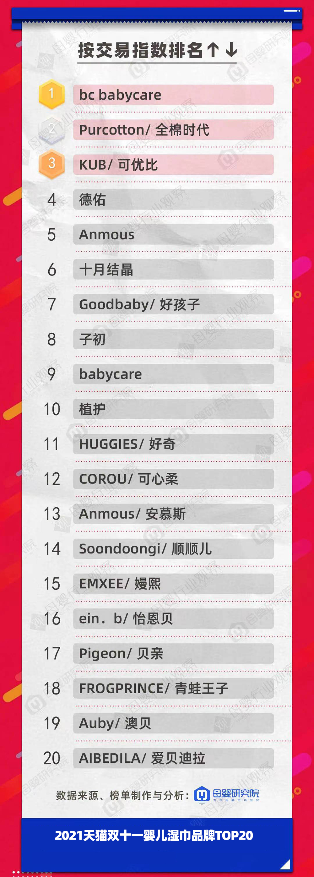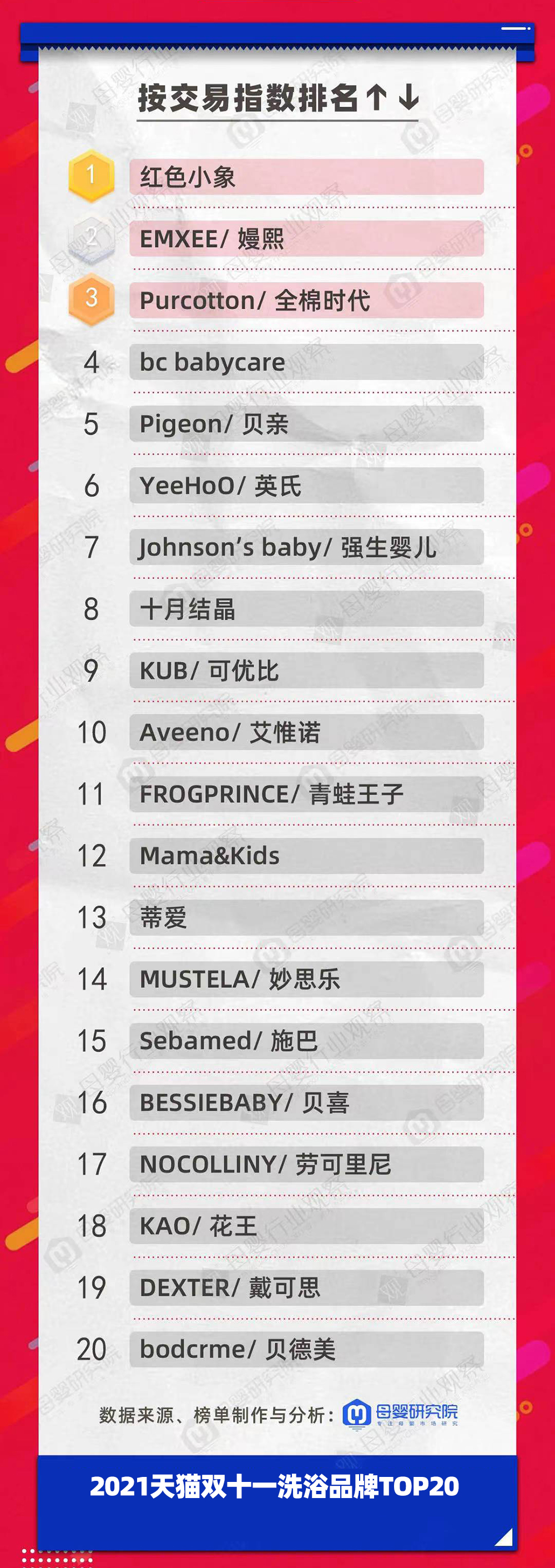 紅色小象、EMXEE嫚熙和Purcotton全棉時(shí)代優(yōu)異地拿下了本次雙11寶寶洗浴品牌的前三。而2020年雙11時(shí),位居前三的是紅色小象、Purcotton全棉時(shí)代和蒂愛。