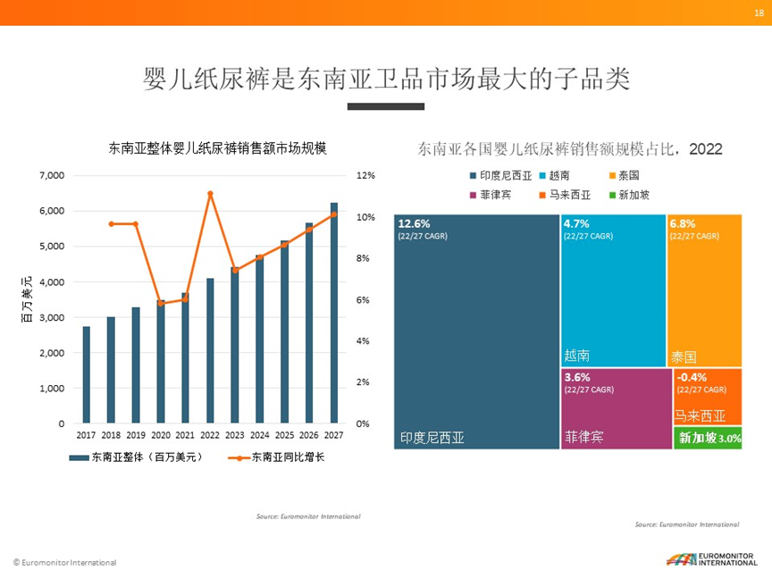 眾多紙尿褲品牌對東南亞市場情有獨(dú)鐘背后,是可觀的市場前景。根據(jù)Euromonitor(歐睿信息咨詢)數(shù)據(jù)顯示,2022年東南亞一次性衛(wèi)品市場整體零售額達(dá)到了65億美元,其中嬰兒紙尿褲是東南亞衛(wèi)品市場最大的子品類,去年市場規(guī)模超過了40億美元,21-22年同比增長達(dá)到將近11%。預(yù)計2027年嬰兒紙尿褲市場會超過60億美元。