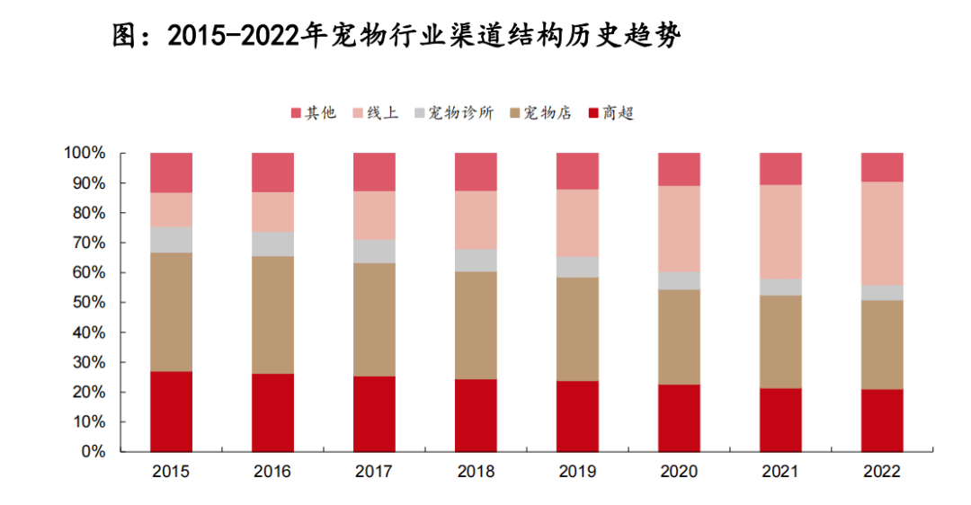 從渠道端來(lái)看,隨著電商平臺(tái)的高速發(fā)展,寵物用品銷售渠道線上化強(qiáng)勢(shì)。寵物用具銷售渠道豐富,線下銷售渠道可細(xì)分為商超、寵物店、寵物醫(yī)院診所等渠道,