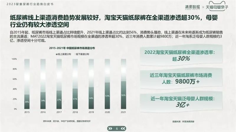 截止2021年,一半以上的紙尿褲都是由線上渠道賣出,消費(fèi)勢(shì)頭強(qiáng)勢(shì)。近三年消費(fèi)人數(shù)累計(jì)超9800萬(wàn),近一年淘系泛母嬰人群已有3億+規(guī)模。