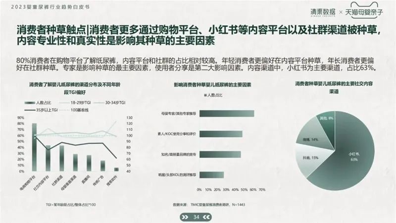 根據(jù)白皮書數(shù)據(jù)統(tǒng)計(jì),80%消費(fèi)者在購(gòu)物平臺(tái)了解紙尿褲,內(nèi)容平臺(tái)和社群的占比相對(duì)較高。年輕消費(fèi)者更偏好在內(nèi)容平臺(tái)種草,年長(zhǎng)消費(fèi)者更偏好在社群種草。專家是影響種草的最主要因素,使用者分享是第二大影響因素。內(nèi)容渠道中,小紅書為主要渠道,占比63%。