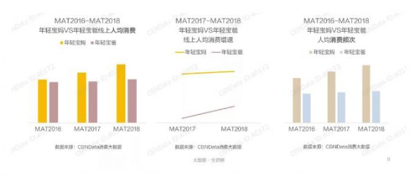 在更為開放、富足的環(huán)境下成長起來的80、90后年輕一代,大多受過良好的教育,生活水平也有所提高,他們在育兒觀念上更加開放,在包括紙尿褲在內(nèi)的眾多母嬰用品上,年輕寶爸寶媽更舍得花錢,他們有強烈的消費意愿,還具備足夠的支付能力,成為母嬰消費市場的中堅力量。數(shù)據(jù)顯示,近年來,年輕寶媽寶爸的線上人均消費逐年提升。相比寶爸,寶媽的增速更快,達(dá)到兩位數(shù)的高速增長,消費潛力巨大。從消費頻次來看,年輕寶媽更愛剁手,他們的消費頻次遠(yuǎn)高于寶爸。